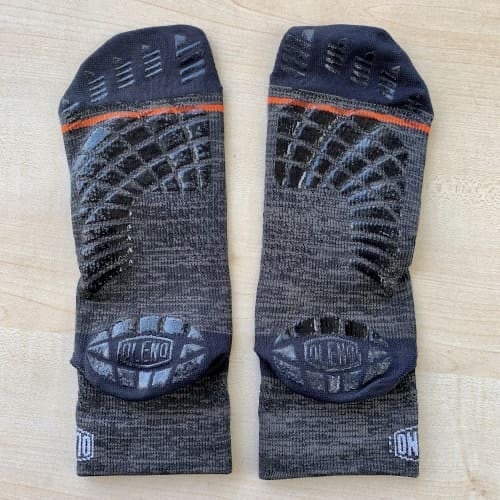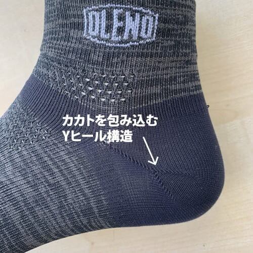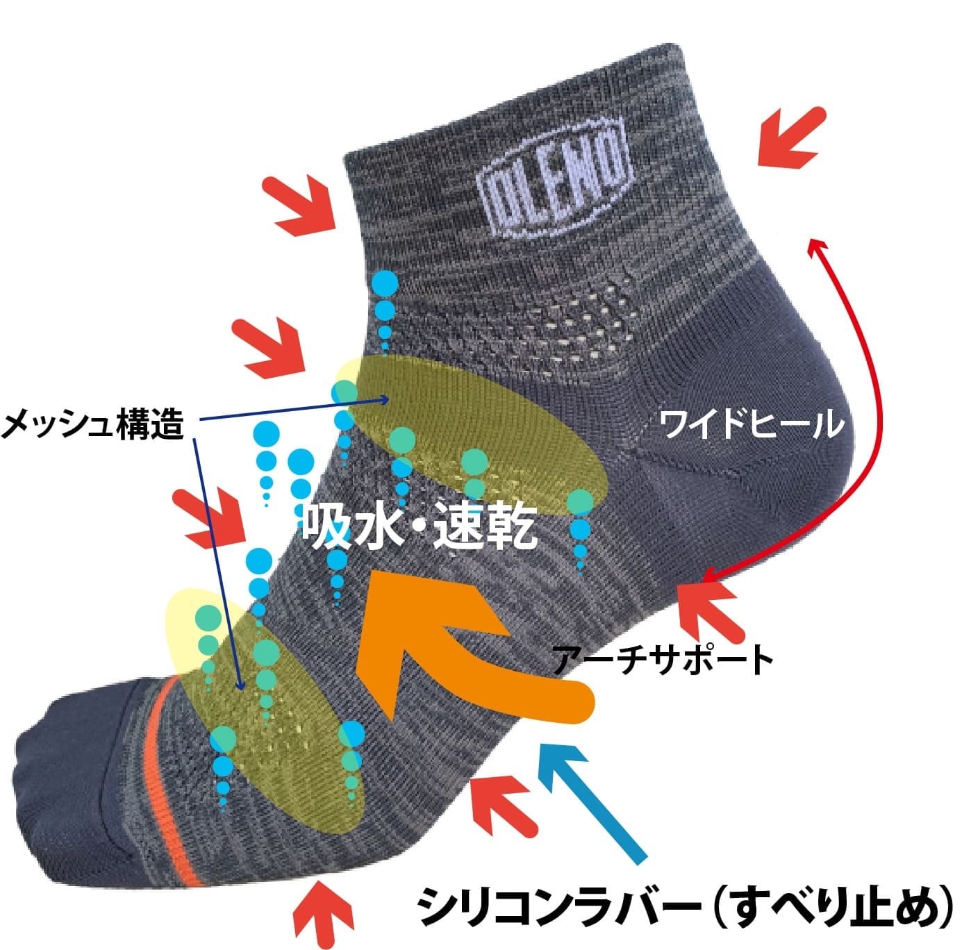 足裏に使用しているのは、OLENOが独自に開発したシリコンラバーの滑り止め。傾斜45度の斜面でも滑らない他を圧倒するグリップ力を実現しており、山の下りや坂道などのシーンでも足が靴の中で動くことを防ぎます。