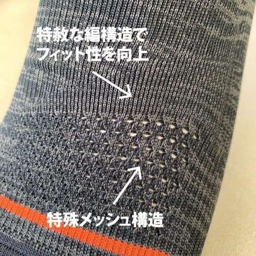 ベース素材に、特殊な異形断面を持つポリエステル素材を採用し、吸水力と速乾力を大幅にUP。時間経過で繊維内にどのぐらいの水分が残っているかといった試験では、通常のランニングソックスの約5倍の差を記録。汗による足裏トラブルで悩んでいる方は一度お試しください。